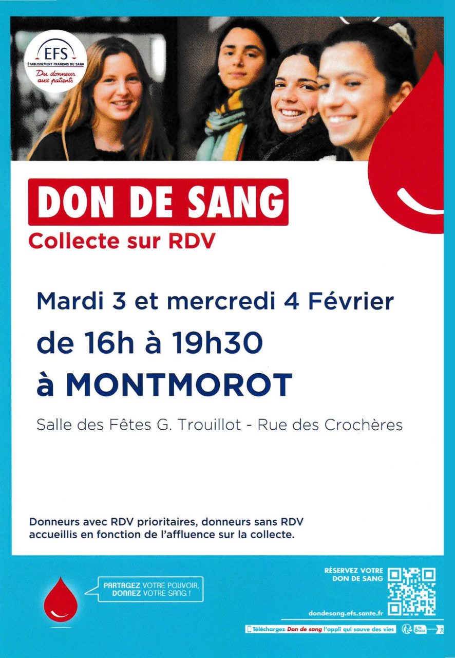 Nous invitons les donneurs et les futurs donneurs à donner leur sang les mardi 3 et mercredi 4 février 2026 de 16h à 19h30 à la salle Georges Trouillot de Montmorot.