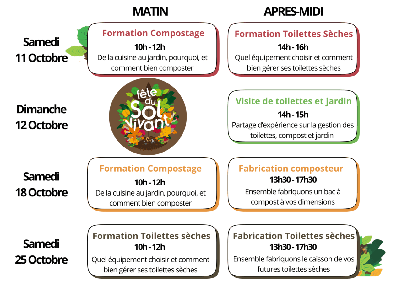 Les places sont limitées à 5 constructions par créneau. Il est demandé d’assister à la formation toilettes sèches (samedi 11 Octobre après-midi ou 25 Octobre matin) pour participer aux ateliers de construction.