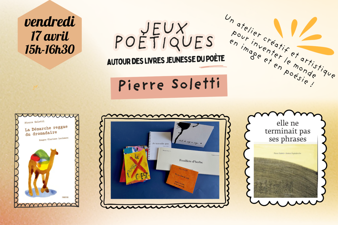 Pour célébrer le Printemps des Poètes, le 17 avril, à 15h, Isabelle Jobard de l’association le Ô des Mots vous propose un atelier créatif de jeux poétiques autour des livres dédiés à la jeunesse du poète Pierre Soletti !